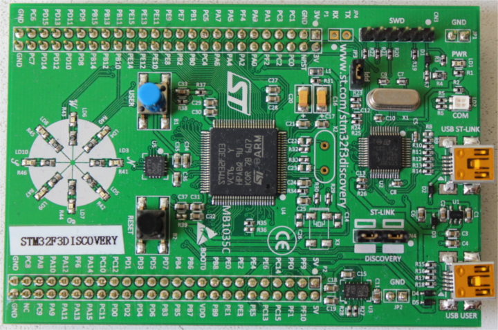 Precaución: tenga cuidado si desea aplicar señales externas a la placa. Los pines del microcontrolador STM32F303VCT6 admiten un voltaje nominal de 3,3 voltios. Para más información, consulte 6.2 Sección de ratings maximos absolutos en el manual